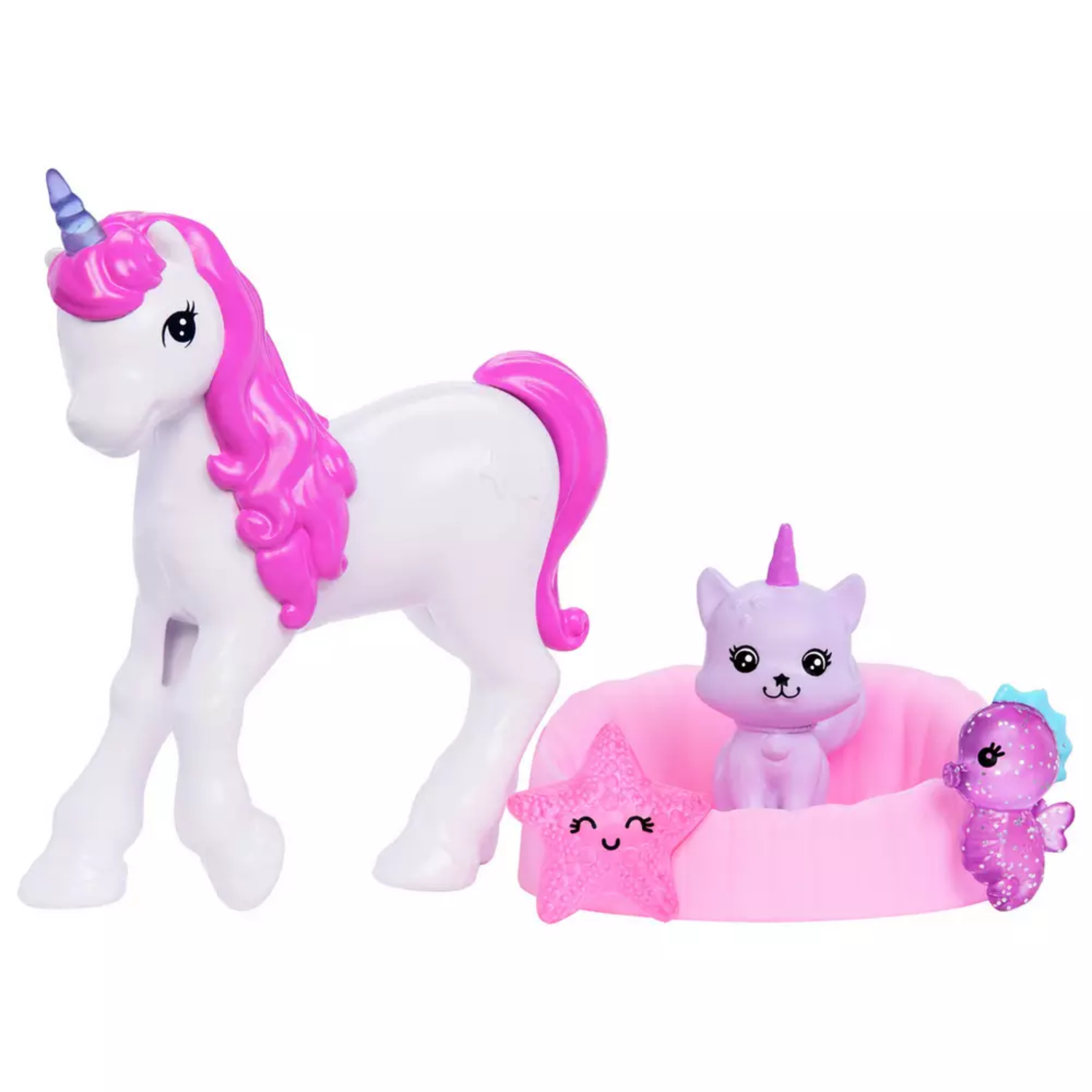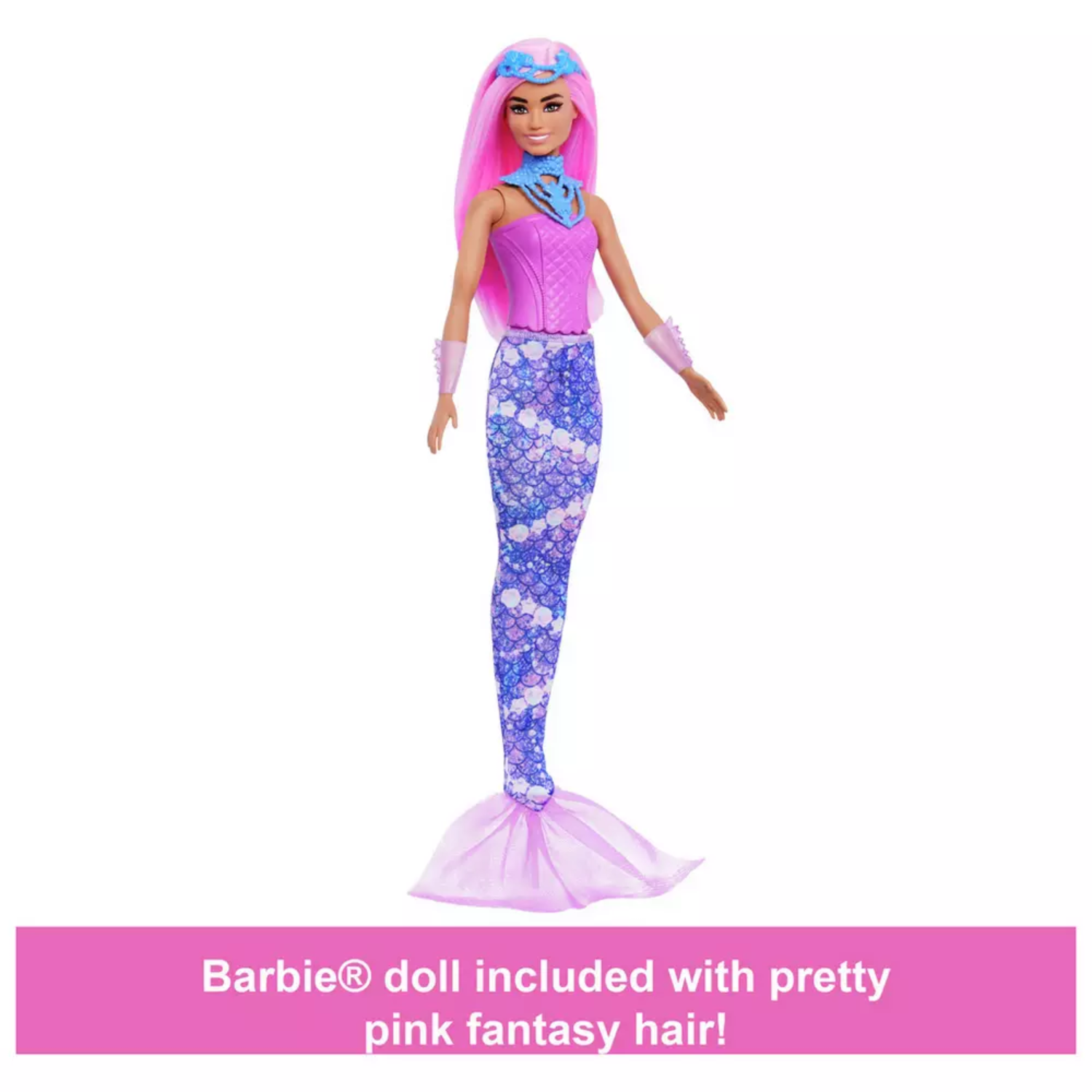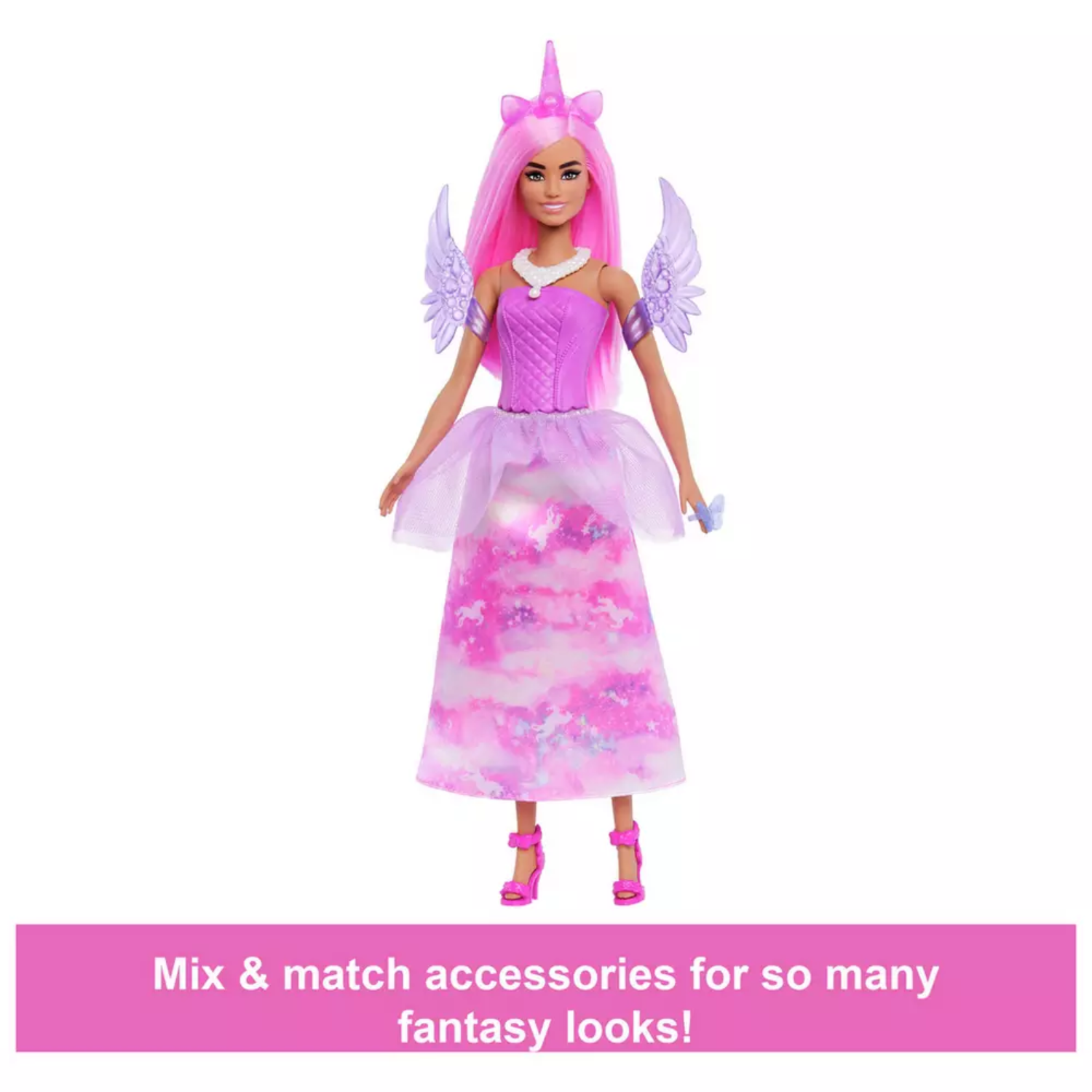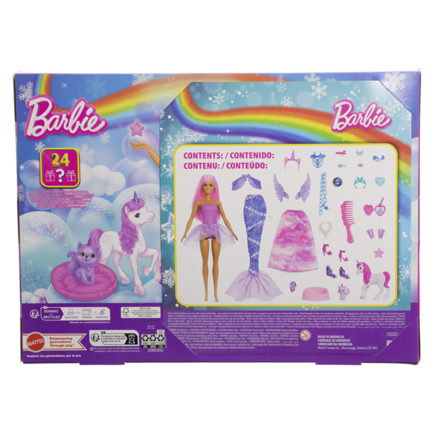 Count down the holidays with this Barbie Advent Calendar filled with fantasy-themed gifts! Open one surprise a day for 24 days (or all at once!) for a magical unboxing experience. Find a Barbie doll with pretty pink hair on the first day, and then clothes and accessories to transform her into a mermaid, royal, or fairy as more are revealed! The daily gifts include a mermaid tail, fairy wings, baby unicorn and other fantasy pet friends, dress-up headbands, and more. Kids can delight in a fantastical holiday with this Barbie Advent Calendar set! Doll cannot stand alone. Colors and decorations may vary.