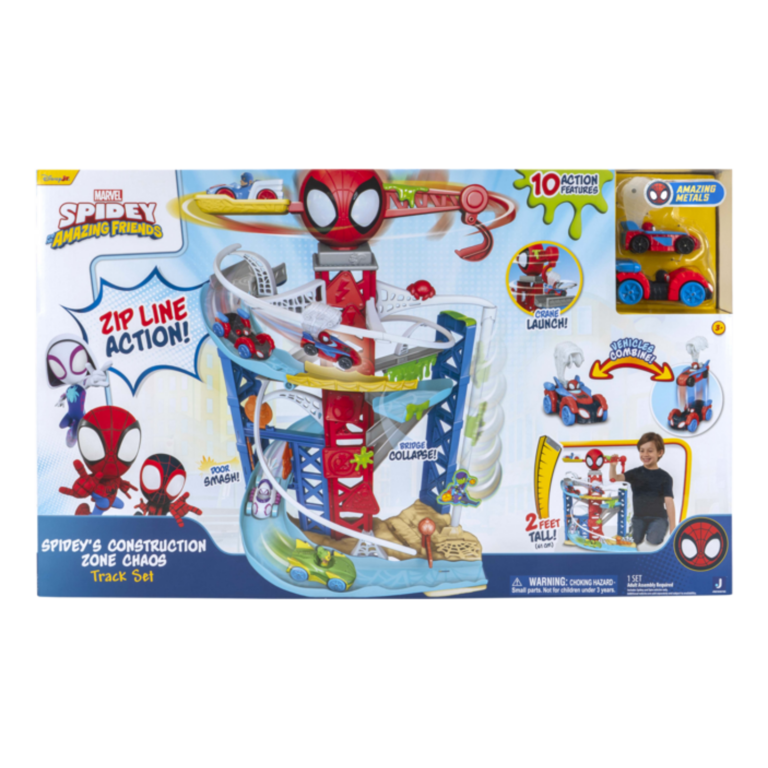 Zip into action with the MARVEL Spidey and His Amazing Friends Construction Zone Chaos Track Set. This deluxe 2-foot high race track features a zip line, multiple action zones, and two separate tracks for both Spidey and Spin. It also includes two exclusive 3-inch Amazing Metals vehicles that combine and split.
