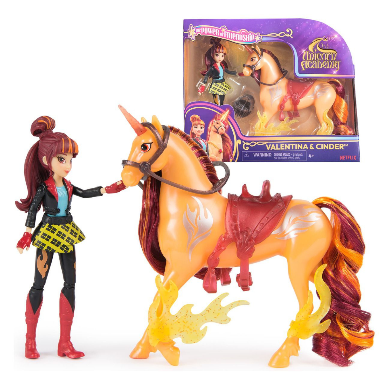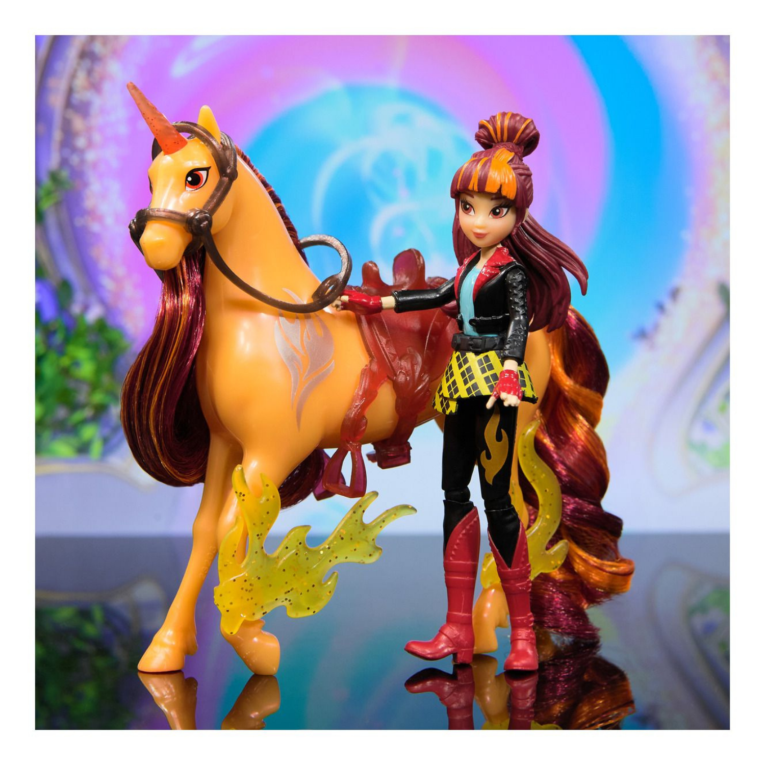 • Cinder 13-cm unicorn toy and doll accessories: Cinder's details include metallic Fire Magic markings, 2 translucent clip-on power accessories, a brush, plus a translucent removable saddle and bridle for added play